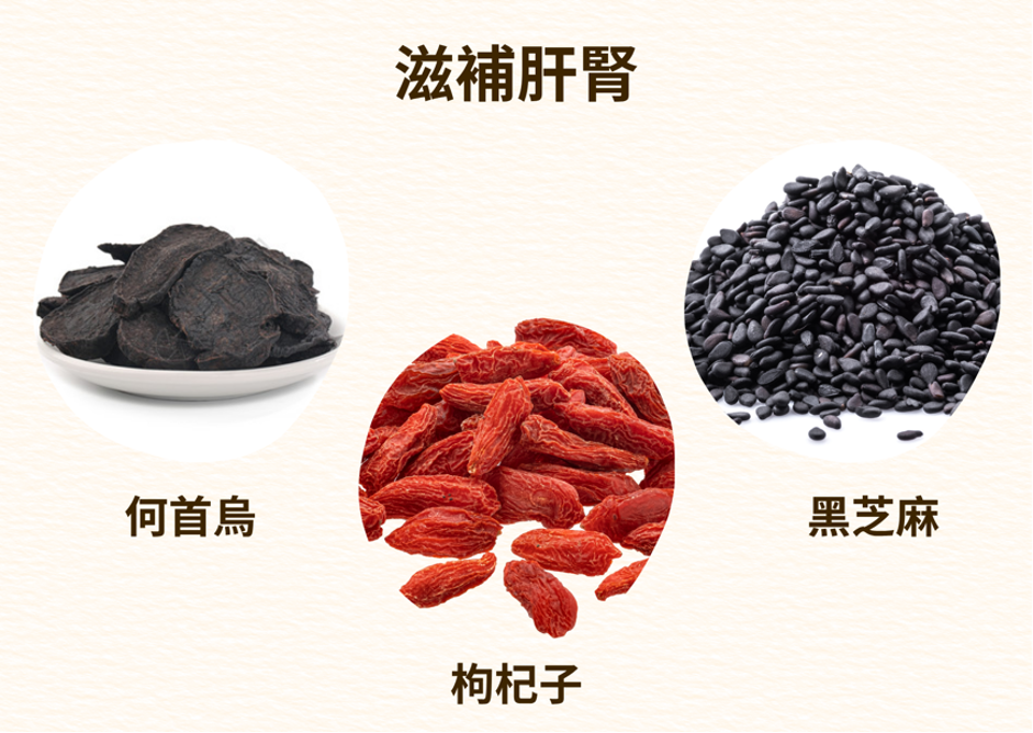 滋補肝腎:製何首烏、枸杞子、黑芝麻(代表方劑:七寶美髯丹)。