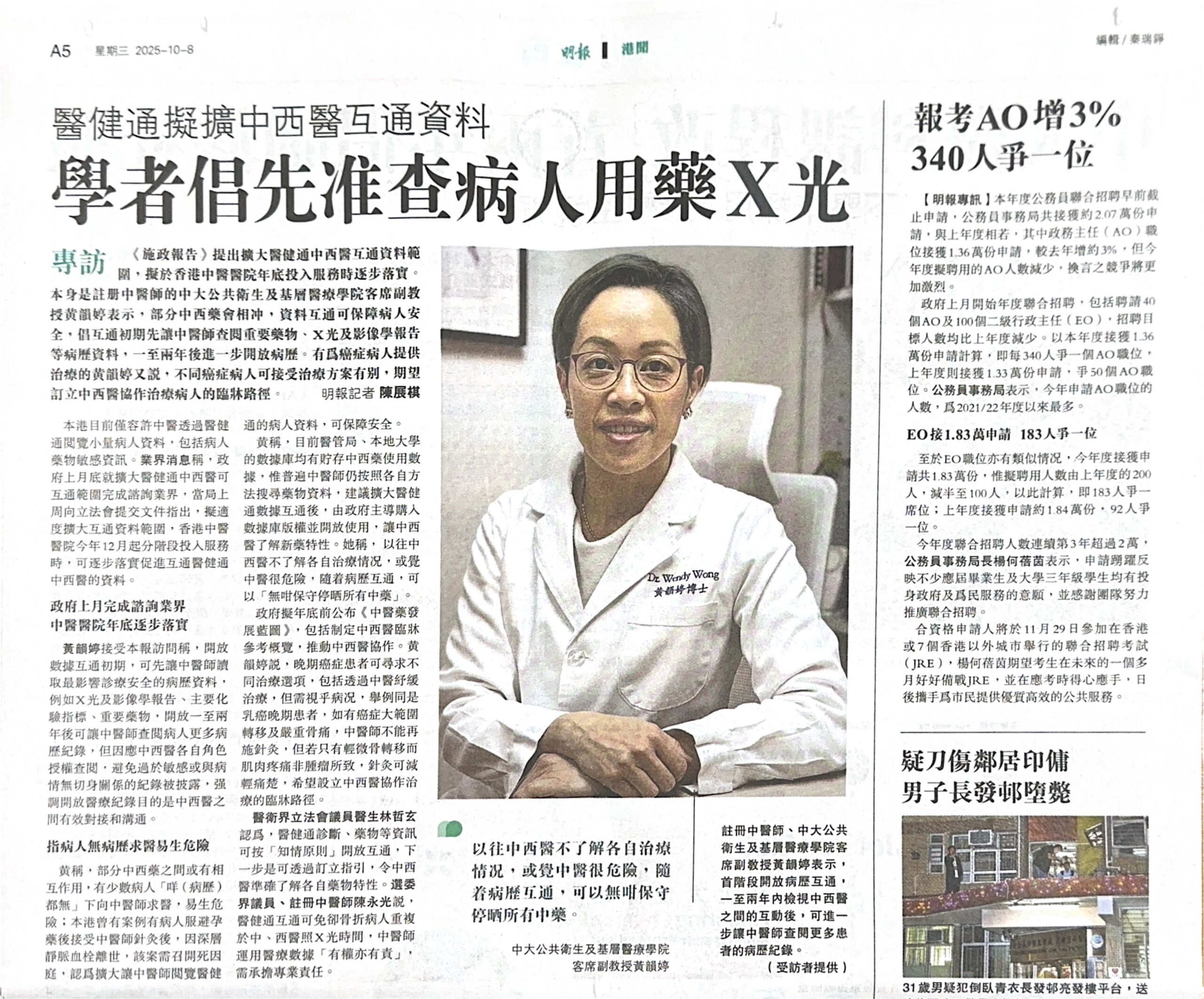 政府將會於2025年10月公布有關醫健通中西醫互通更多的細節,雖然目前未有太多詳情,但報館已經想向我們簡單請教幾個問題,今次由黃韻婷博士接受明報訪問,解答以下幾個觀點: