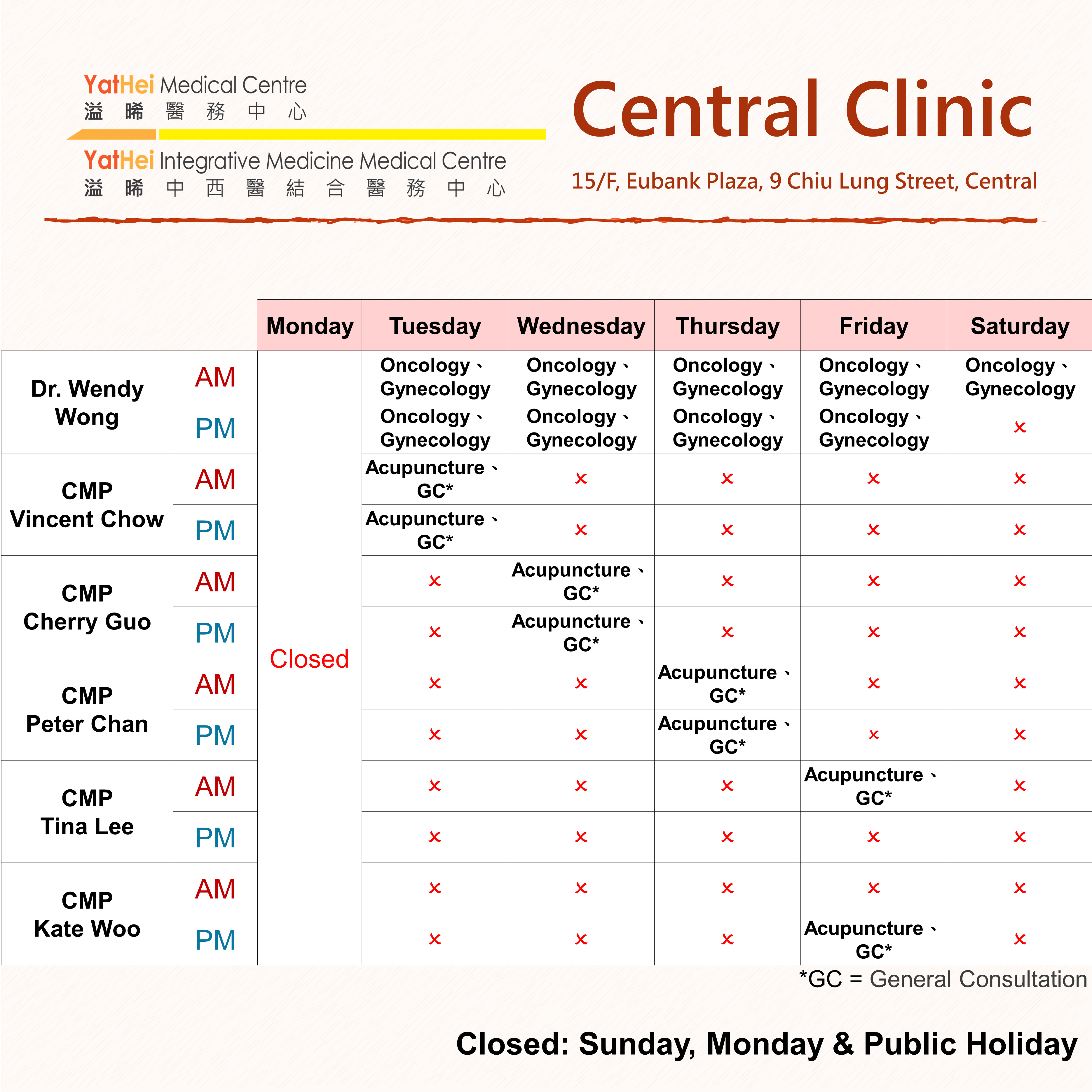 Yat Hei Medical Centre integrated Chinese and Western medicine services, including oncology, internal medicine, gynecology, dermatology, acupuncture etc.